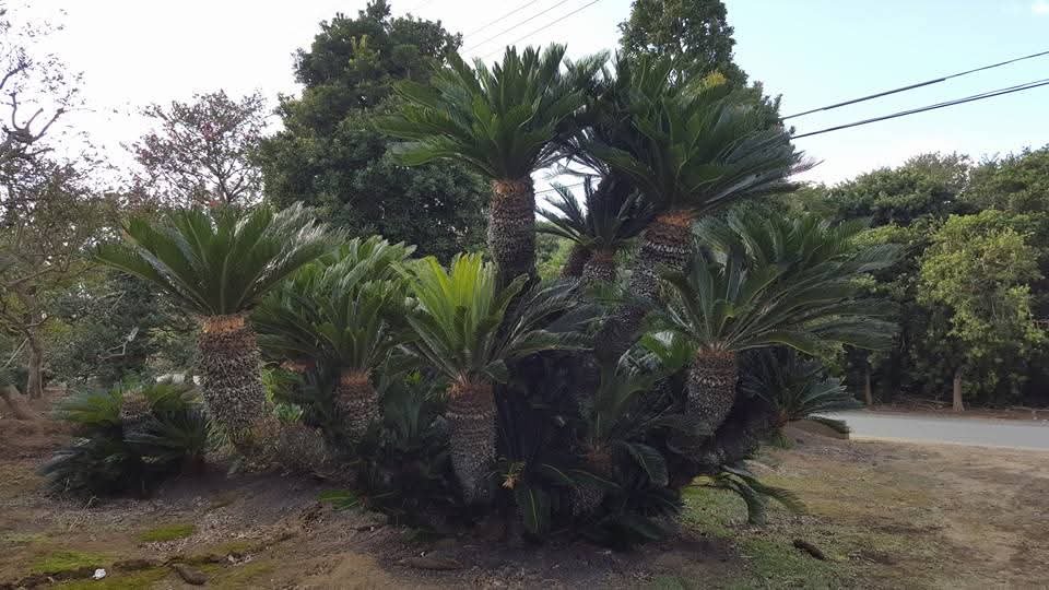 (Ancient, palm-like plants with thick trunks and stiff, evergreen leaves. They date back to the time of dinosaurs.)